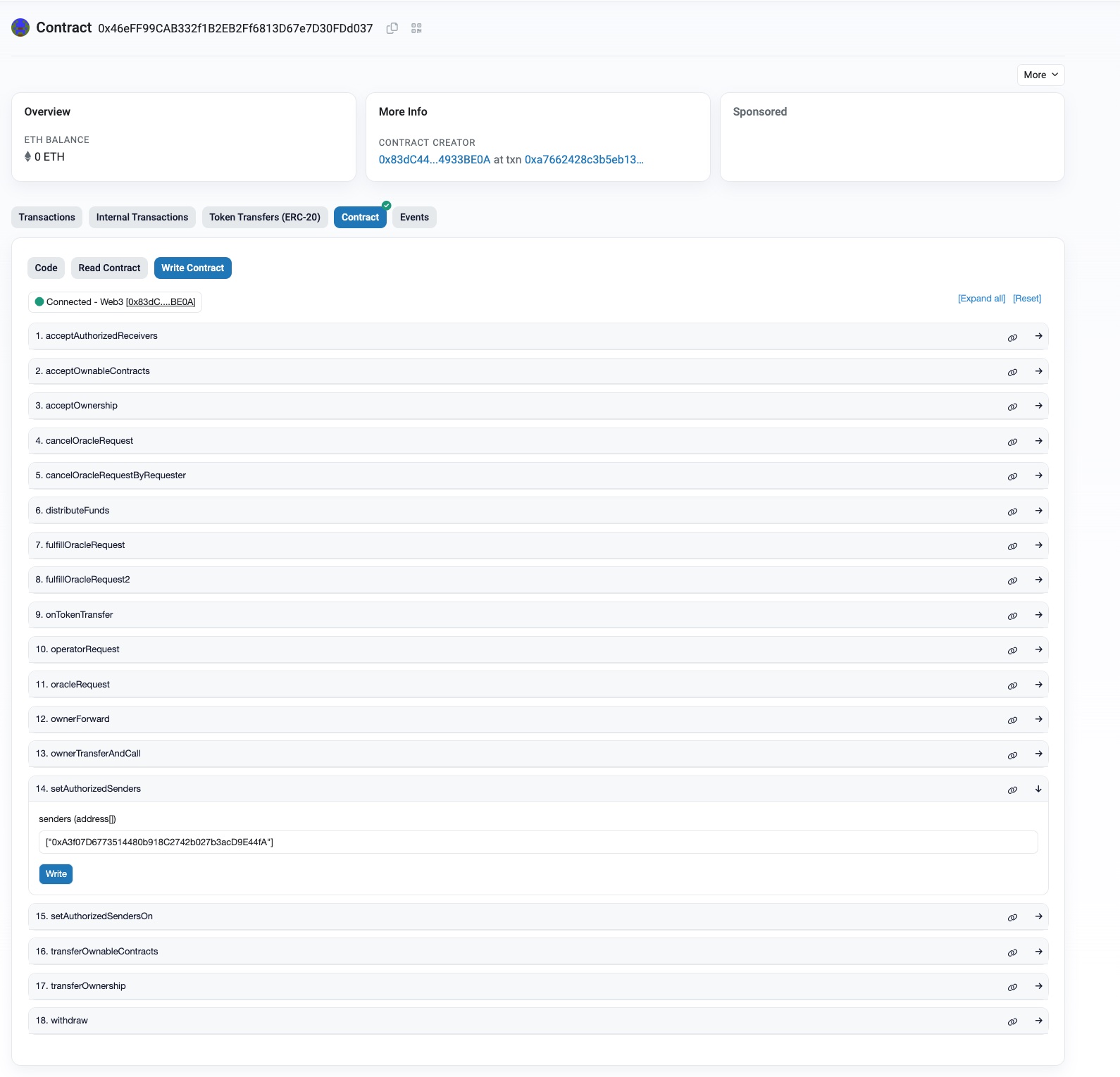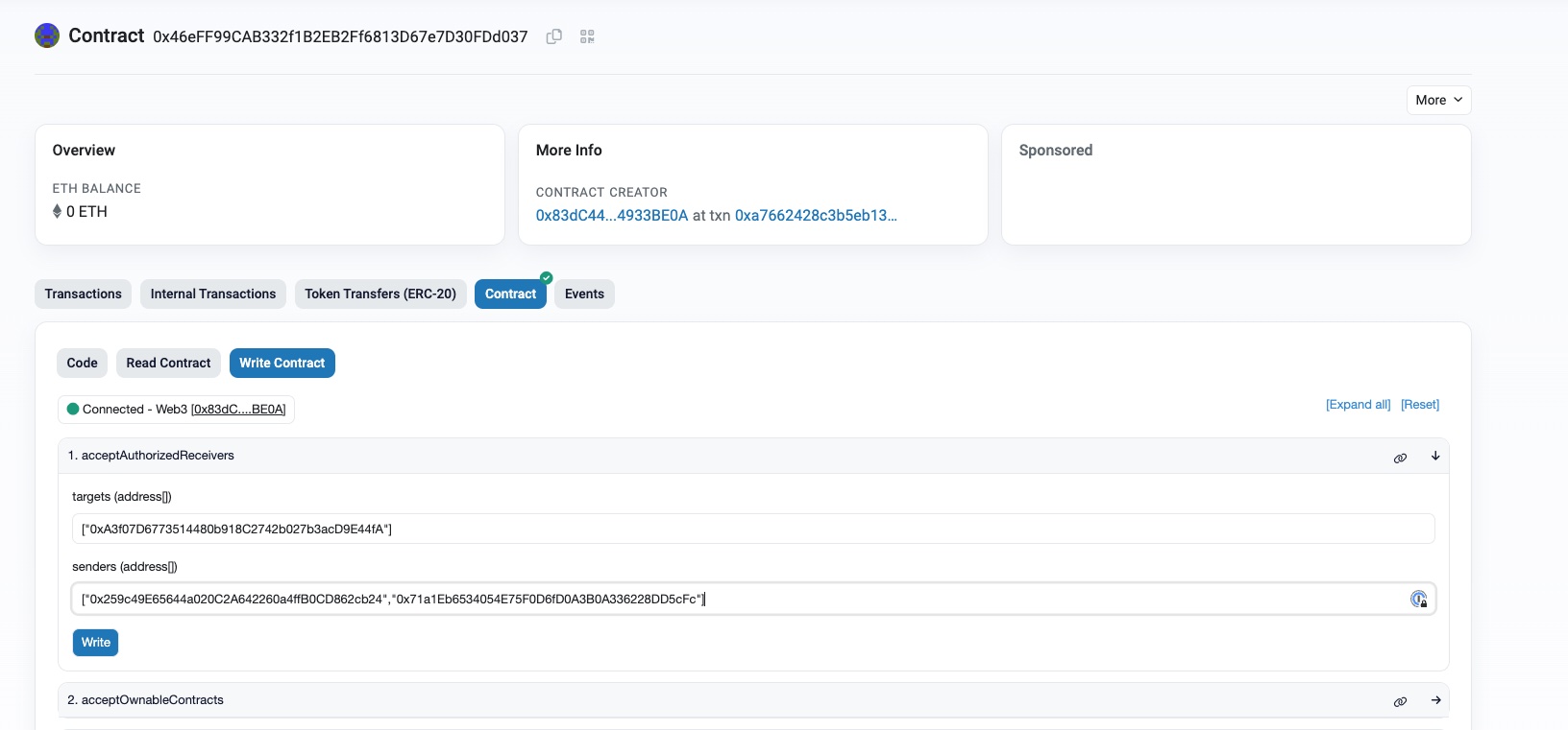 In the blockchain explorer, view the operator contract and call the acceptAuthorizedReceivers method with the following parameters: