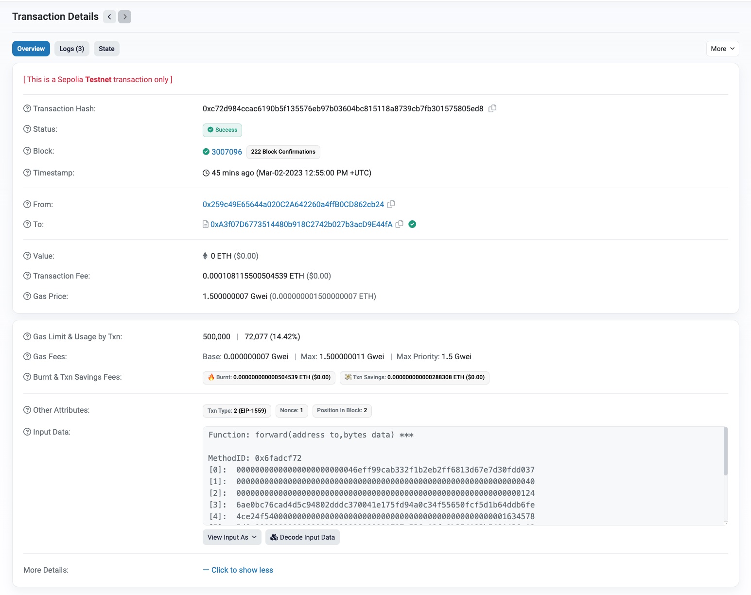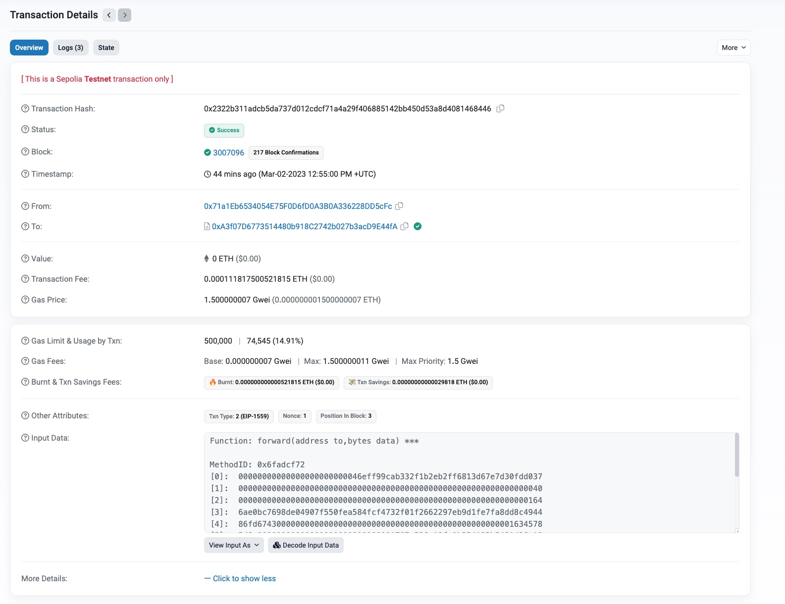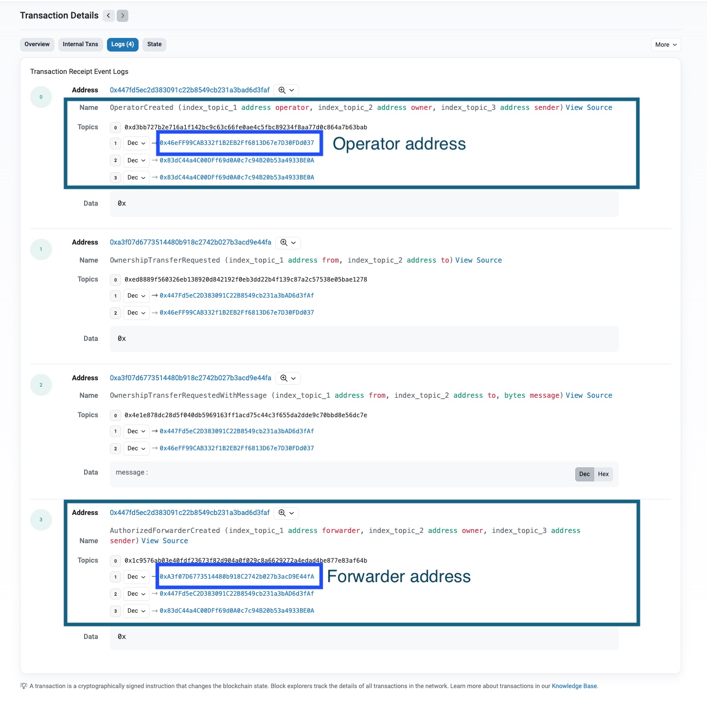 6. On the Transaction Details page, click Logs to display the list of transaction events. Notice the OperatorCreated and AuthorizedForwarderCreated events.