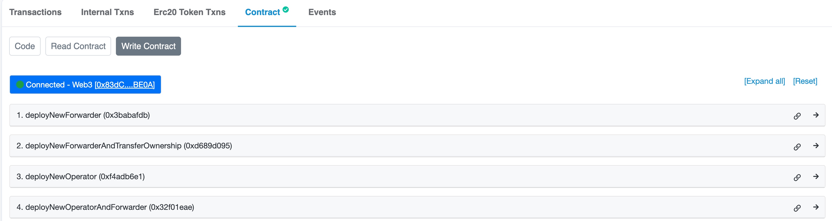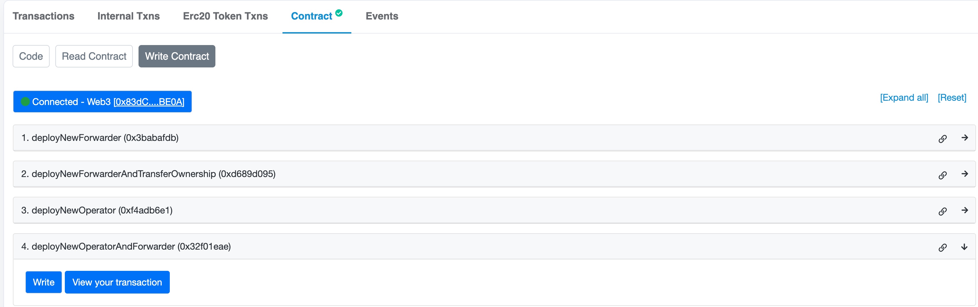 2. Click the Contract tab. Then, click Write Contract to display the write transactions on the factory.