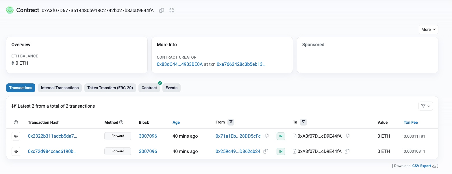 • targets: Specify an array of forwarder addresses. For example, ["0xA3f07D6773514480b918C2742b027b3acD9E44fA"]