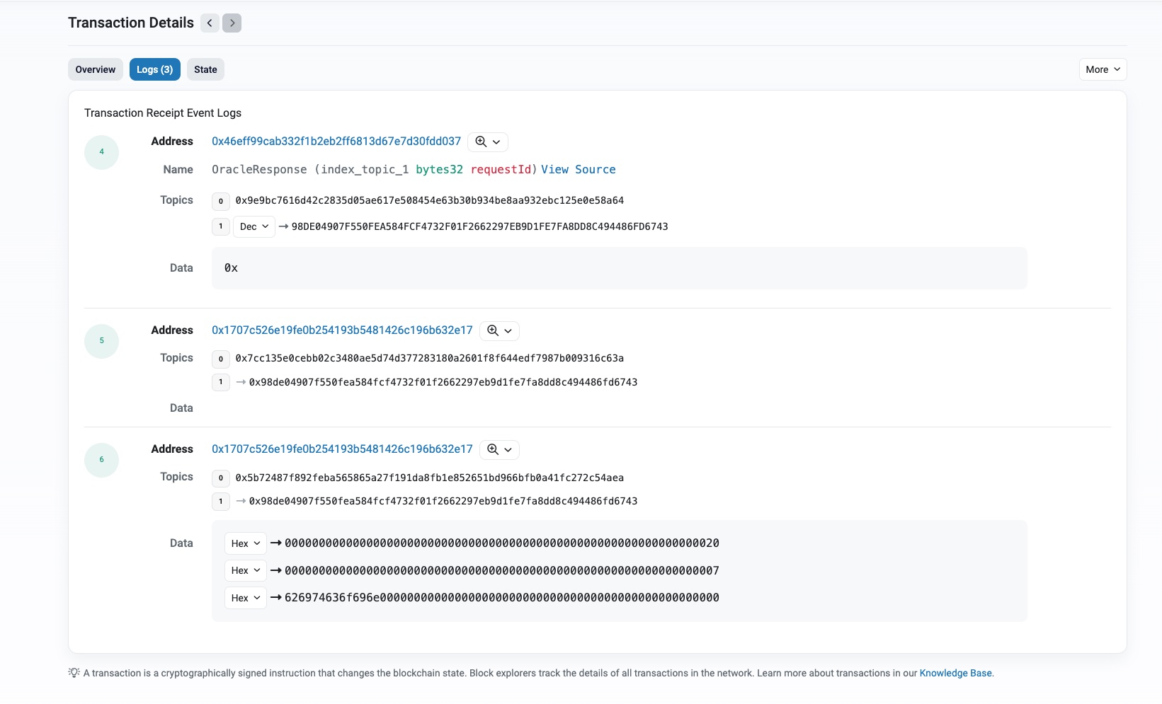 Then click on the Logs tab to display the list of events. Notice the OracleResponse events. The operator contract emitted them when the Forward contract called it
