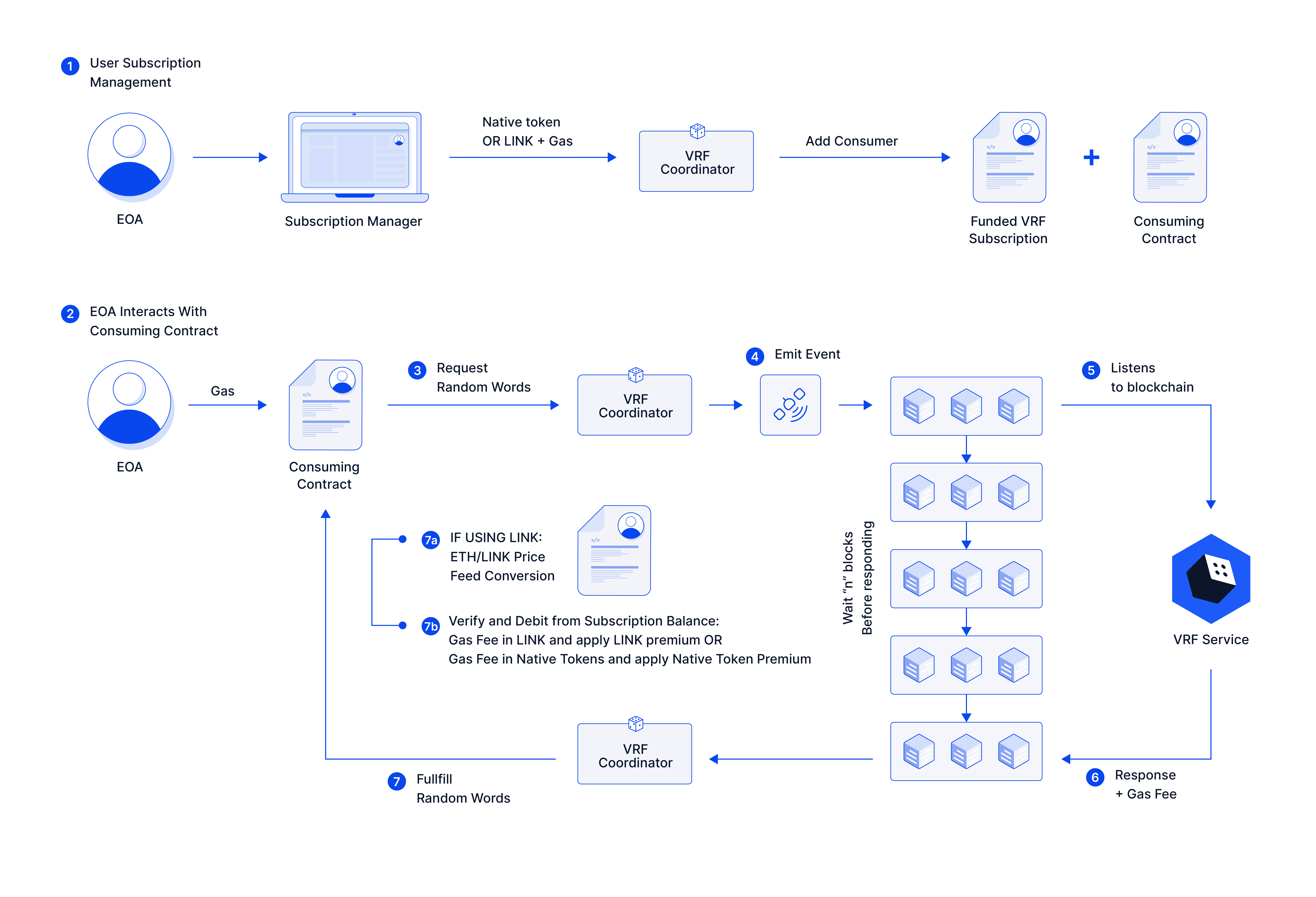 - VRF service (offchain component): Listens for requests by subscribing to the VRF Coordinator event logs and calculates a random number based on the block hash and nonce. The VRF service then sends a transaction to the